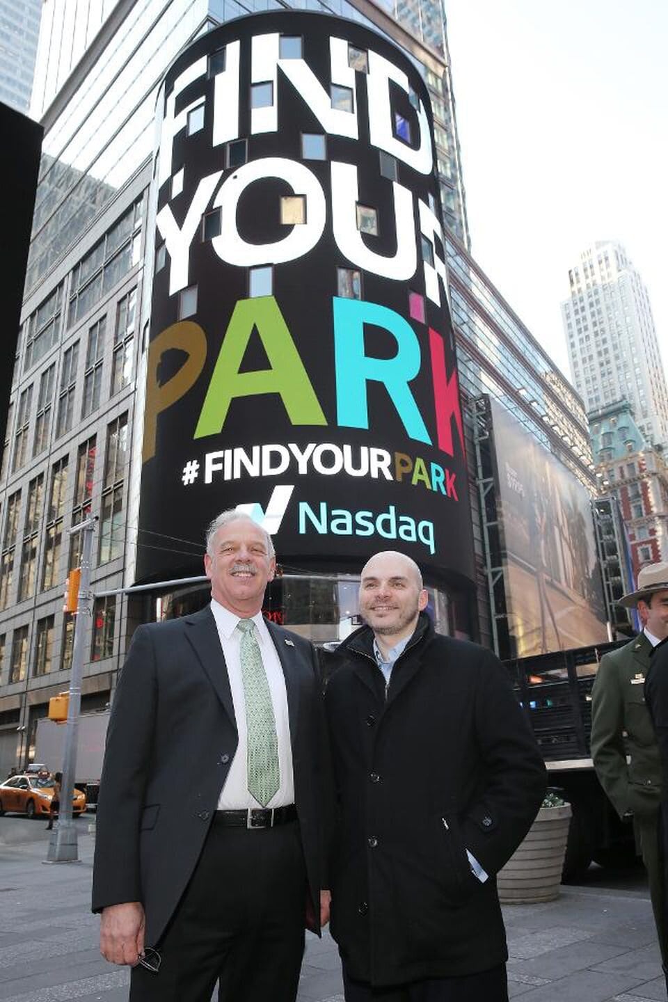 Dan Wenk – Chủ tịch của National Park Foundation (bên trái) và David French, SVP, Marketing, Communications & Corporate Partnership tại National Park Foundation, tham dự buổi ra mắt của Find Your Park tại Quảng Trường Thời Đại vào ngày 2 tháng 4 năm 2015 ở New York.
