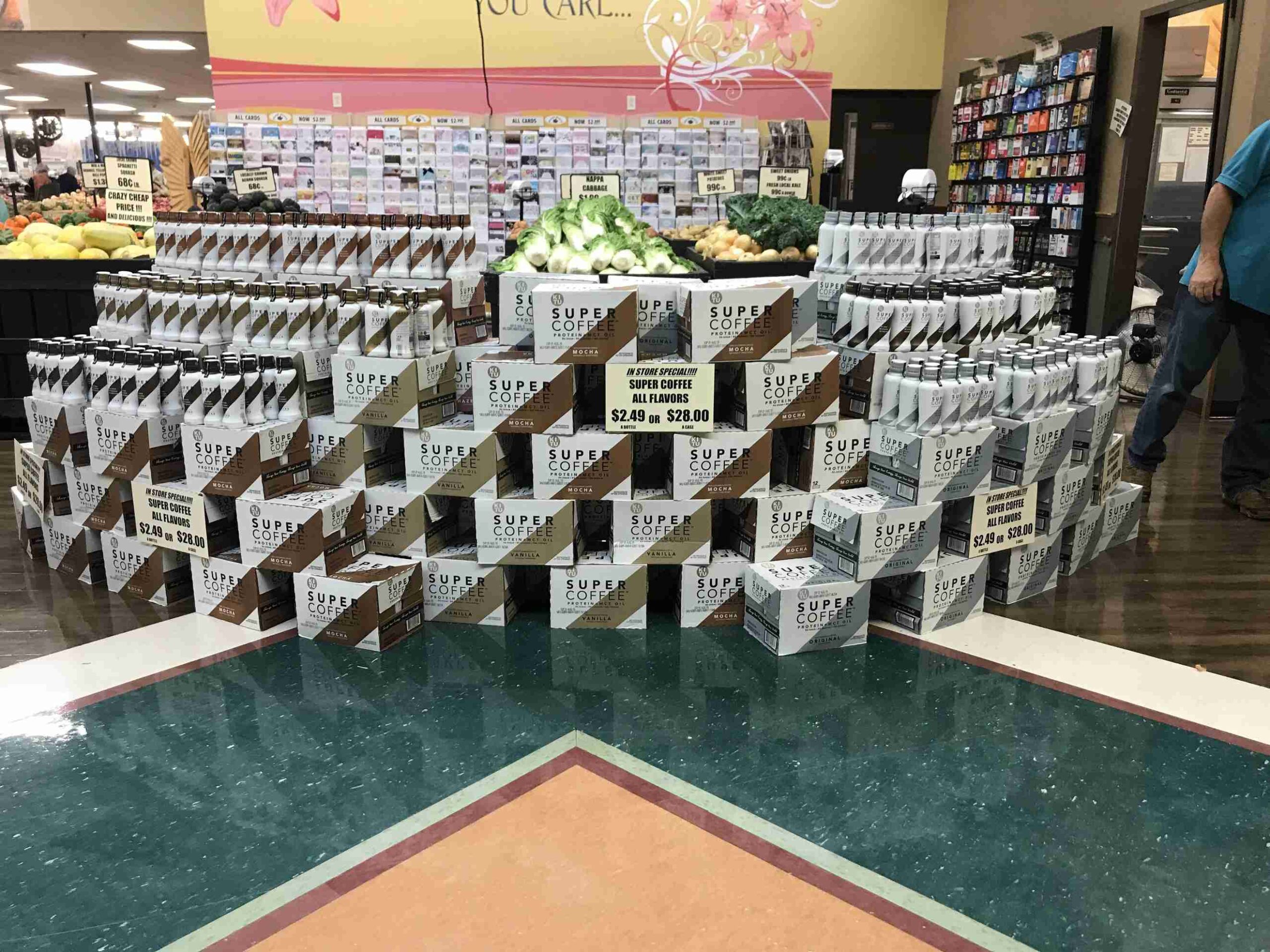Là thương hiệu bột cà phê trộn Protein, Super Coffee tận dụng chính bao gì sản phẩm của mình tạo nên một khối trưng bày hấp dẫn. Cái đẹp đến từ sự đồng đều, đồng thời làm nổi bật 2 sản phẩm khác nhau của họ. Đơn giản mà hiệu quả.
