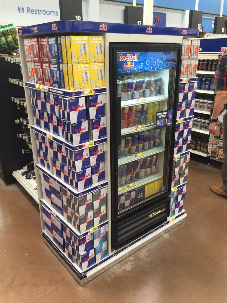 Trưng bày sản phẩm có bao bì nổi bật, dễ nhận thấy sẽ thu hút khách hàng tốt hơn hình ảnh thuần túy, chúng ta đã thấy nguyên lý này qua ví dụ của Old Spice và Super Coffee. Các hộp sản phẩm thanh mảnh với hoa văn ca rô, màu xanh và trắng kết hợp hoàn hảo thành một khối đồng nhất. Chúng giúp các khách hàng thân thiết nhanh chóng nhận ra sản phẩm mình ưa thích. Kết hợp với 1 tủ mát được đặt ở vị trí tiện lợi, Red Bull gần như bất khả chiến bại.