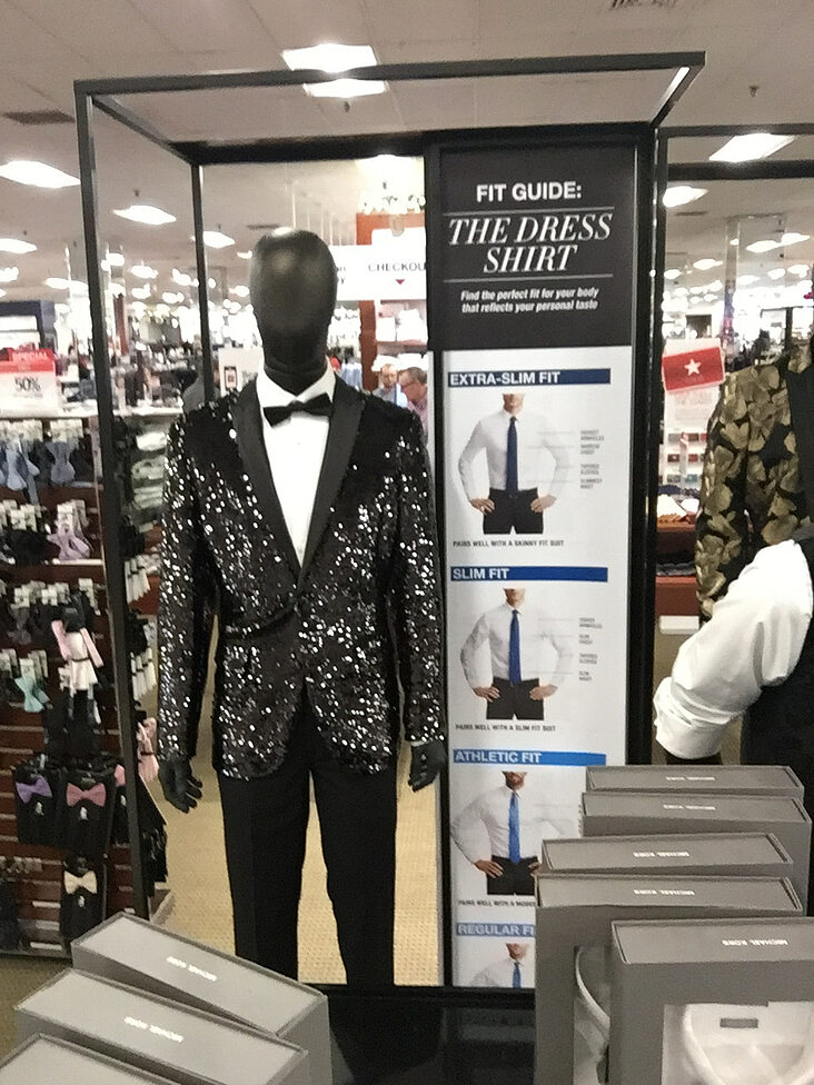 Macy sáng tạo chiến thuật poster bằng cách trưng ra một bảng thông tin, gồm hình ảnh về kích cỡ áo, kiểu áo cùng tất cả thông tin cơ bản cho 1 chiếc áo comple. Kết hợp các thông tin này với mô hình người mẫu, Macy có một chiến thuật trưng bày tuyệt vời, giúp khách hàng nắm bắt thông tin và dễ dàng hình dung sản phẩm.