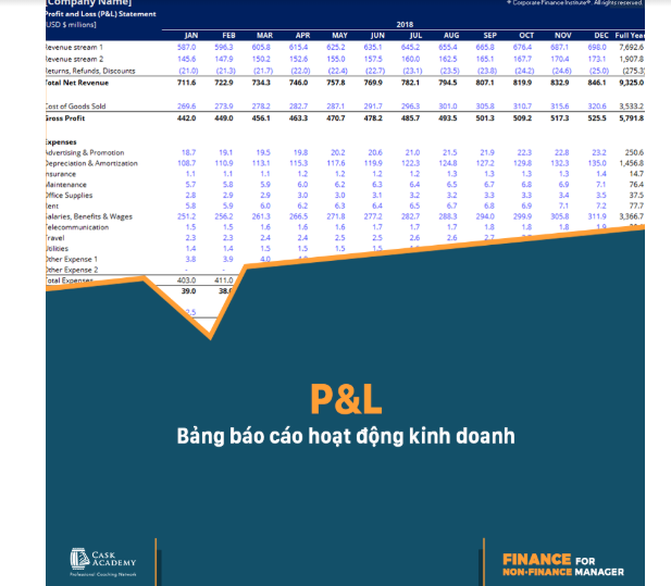 P&L (Báo cáo lời & lỗ) là bảng báo cáo phổ biến và được nhiều người sử dụng nhất. Về cơ bản, P&L trả lời câu hỏi: Công ty này có đang hoạt động hiệu quả hay không? Nó ghi nhận lại tất cả những chi phí và nguồn thu đến từ một hoạt động kinh doanh cụ thể, bao gồm: Tiền thu về, chiết khấu, các chi phí tạo ra sản phẩm, chi phí Marketing, lương thưởng cho nhân viên,… và cuối cùng là lợi nhuận đem về.