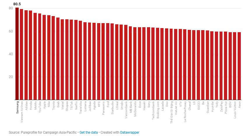 Theo bảng xếp hạng Top 50 Thương hiệu hàng đầu Đông Nam Á do Campaign phối hợp cùng Pureprofile công bố tại sự kiện Campaign 360, người tiêu dùng ở sáu thị trường (Indonesia, Thái Lan, Malaysia, Philippines, Việt Nam và Singapore) đã đánh giá các thương hiệu dựa trên 9 tiêu chí: mức độ nhận biết, chất lượng, trải nghiệm mua hàng, dịch vụ khách hàng, sự đổi mới, lòng trung thành, tần suất mua, mức độ giới thiệu và sự hiện diện thương hiệu (touchpoints).