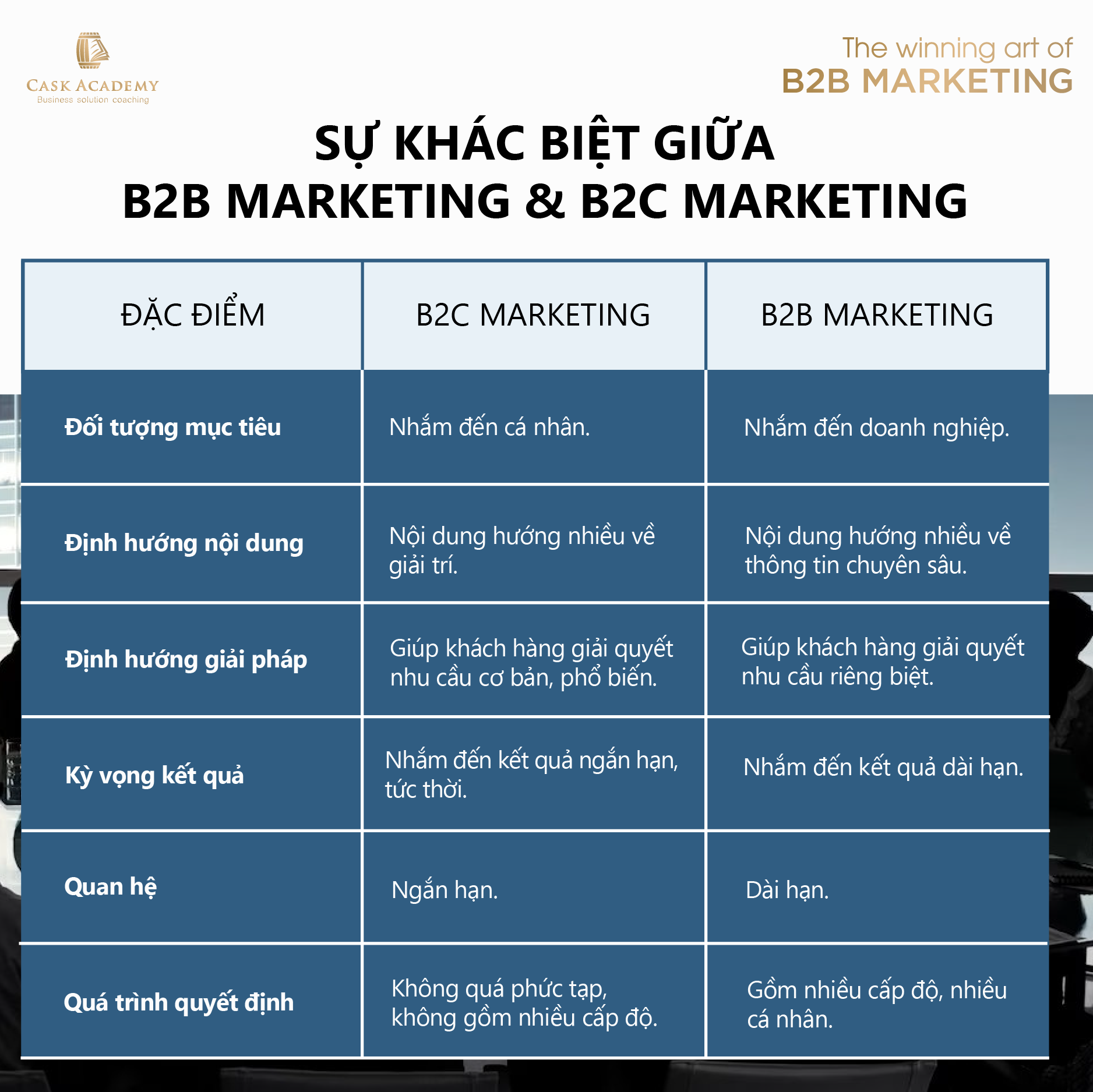 So với loại hình B2B, làm Marketing cho khách hàng cá nhân có phần nào dễ dàng hơn bởi mỗi Marketer cũng chính là một người tiêu dùng, một Shopper. Chỉ cần đổi vai trò một chút, bạn có thể hiểu được người tiêu dùng nghĩ gì, hành xử… ra sao. Còn nói đến B2B, bạn như bước vào một thế giới khác. Khách hàng của bạn là một tổ chức – gồm nhiều cá nhân; hiểu được suy nghĩ, hành vi từng cá nhân đã khó, huống hồ các cá nhân ấy lại còn tương tác, ảnh hưởng lẫn nhau đến quyết định kinh doanh cuối cùng. Quả là một thách thức; nhưng đã có bài toán, cũng sẽ có lời giải. Hãy cùng Cask tìm hiểu những kiến thức cơ bản về B2B Marketing và những điều cần lưu ý khi bước vào lĩnh vực này nhé!