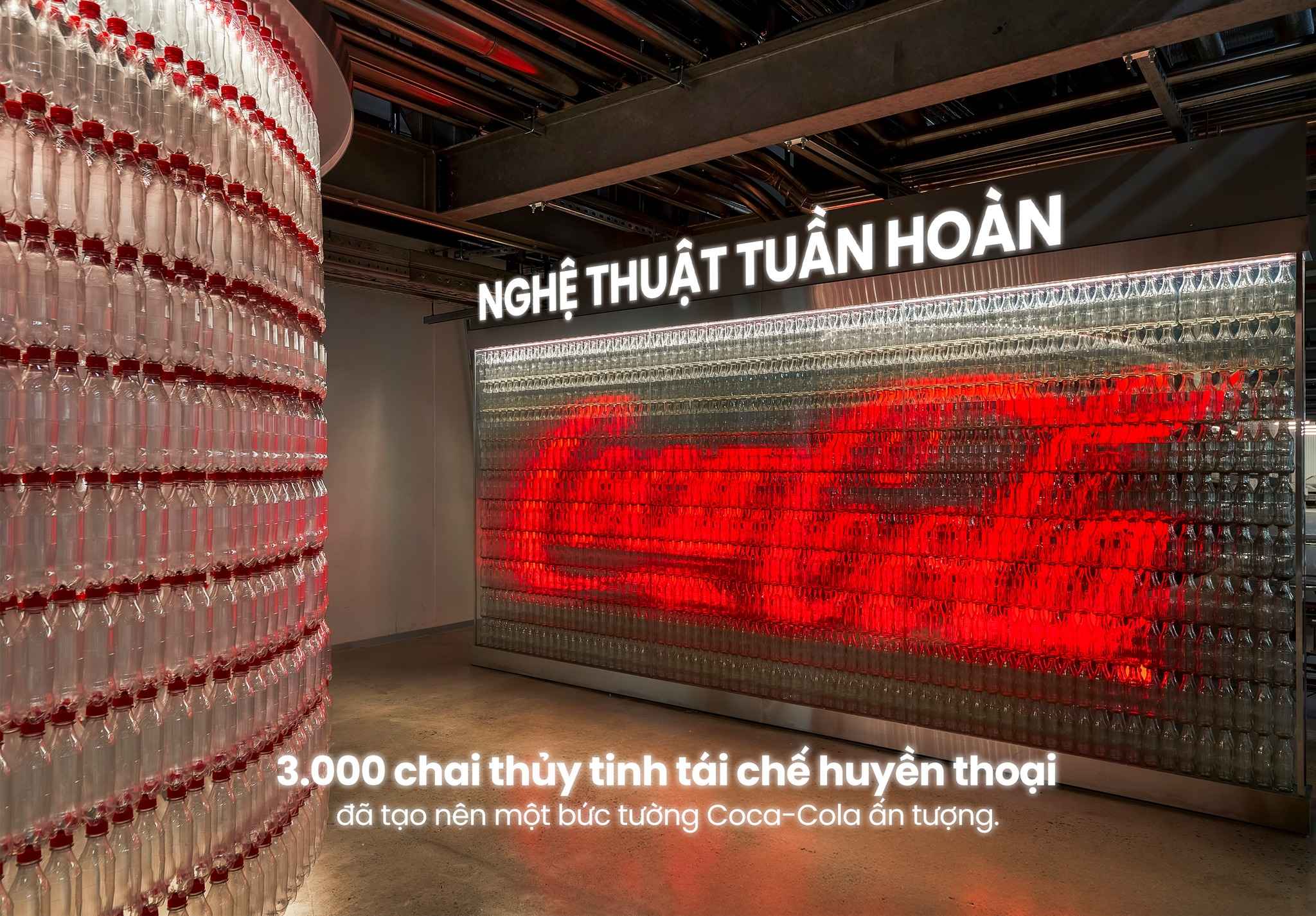 Bên cạnh đó, một tác phẩm nghệ thuật khác sử dụng 3.000 chai thủy tinh gợi nhắc đến hình ảnh quen thuộc của Coca-Cola trong ký ức nhiều thế hệ. Các vật liệu tái chế không chỉ là yếu tố thiết kế, mà còn là thông điệp trực tiếp về định hướng phát triển bền vững mà Coca-Cola muốn truyền tải.