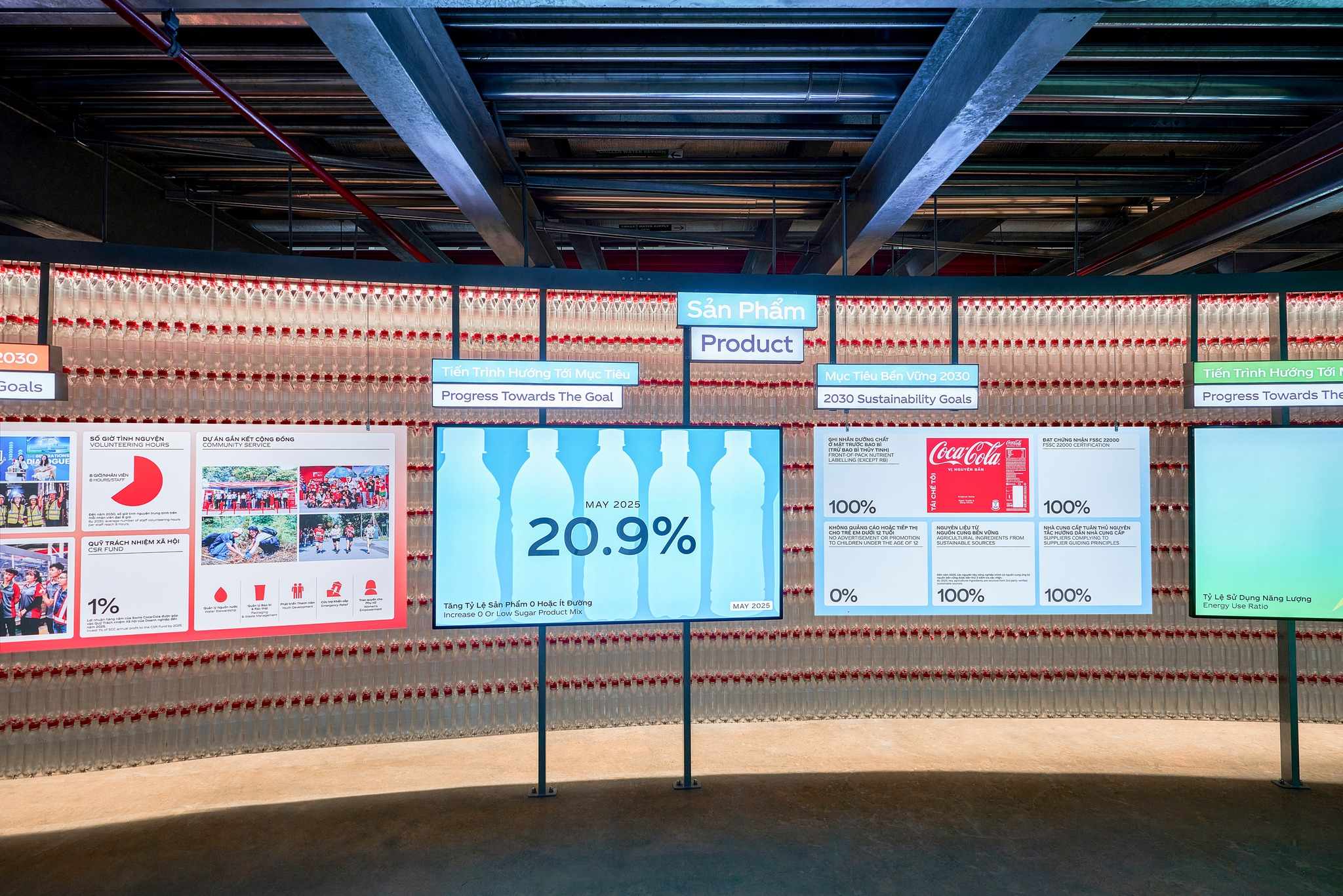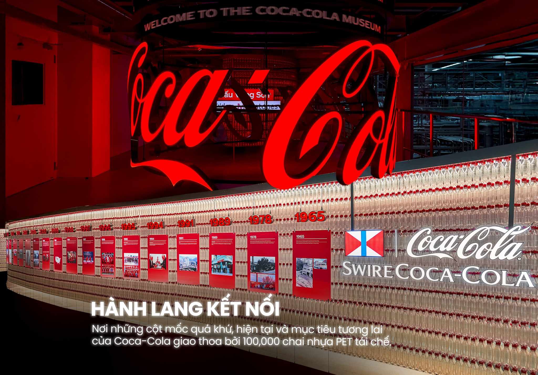 Tại bảo tàng, khách tham quan dễ dàng nhận ra dấu ấn bền vững trong từng chi tiết. Một bức tường dài 100 mét được ghép từ 100.000 chai nhựa tái chế trở thành điểm nhấn nổi bật, nhấn mạnh mục tiêu giảm rác thải nhựa của Coca-Cola tại Việt Nam.