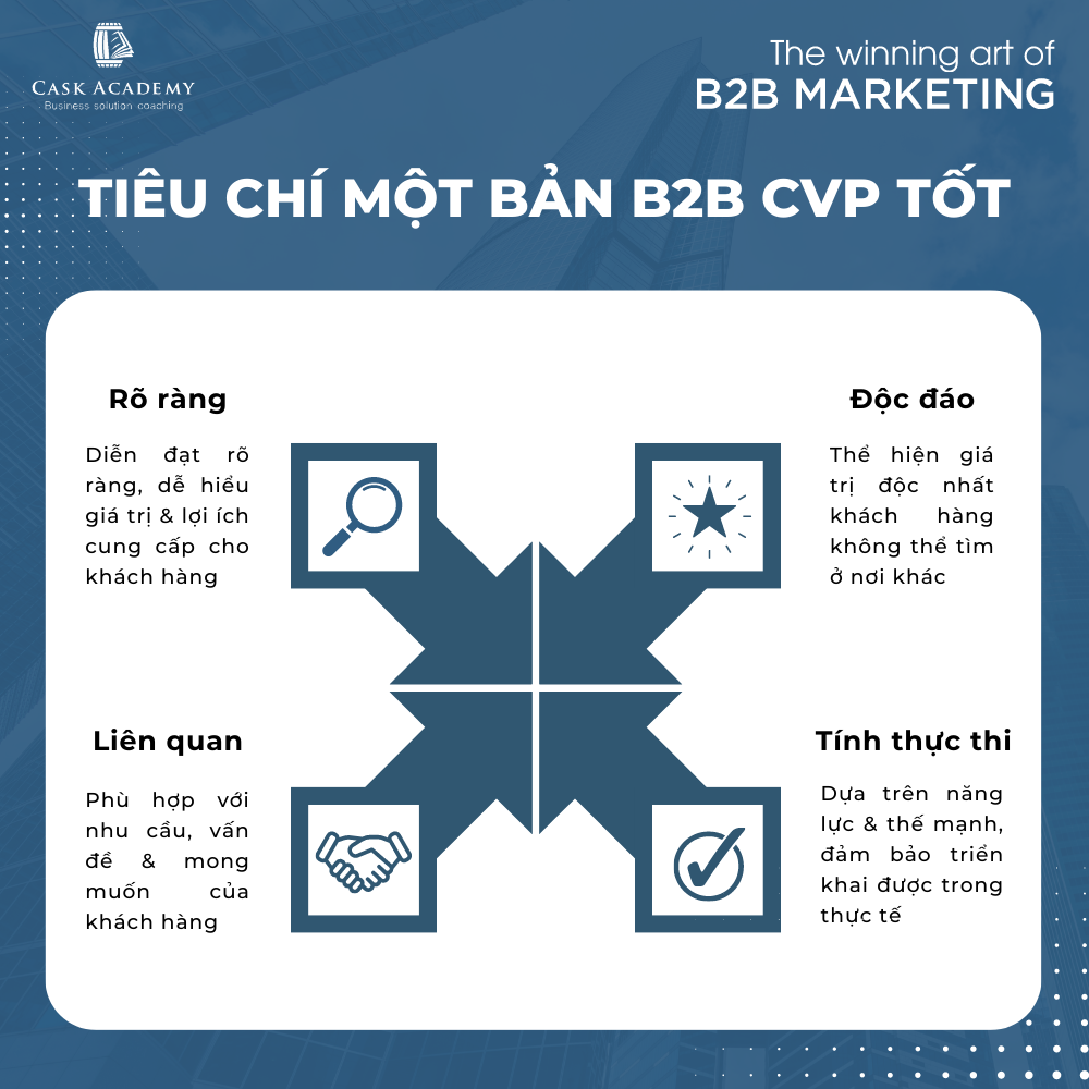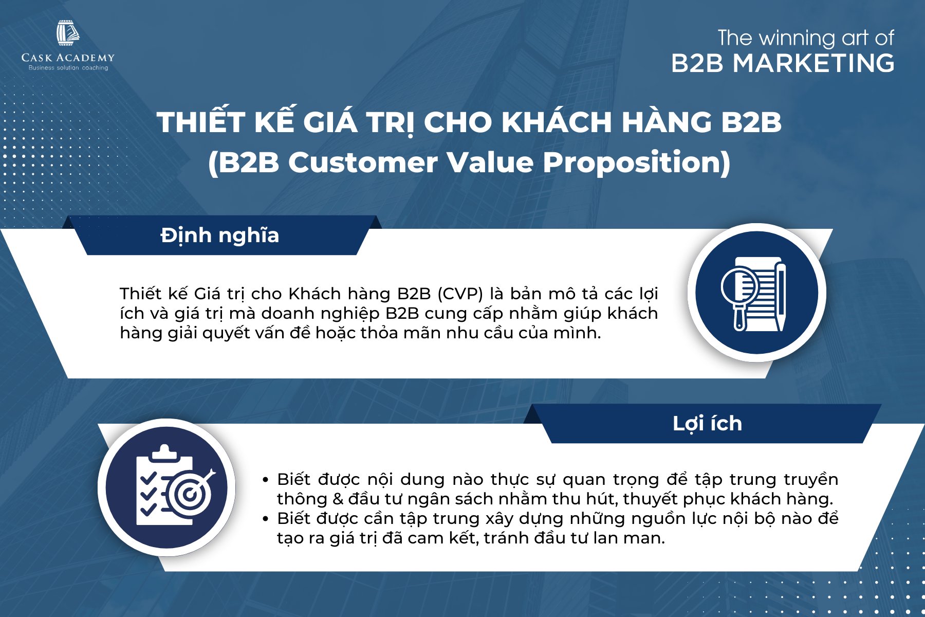 Thiết kế Giá trị cho Khách hàng B2B – B2B Customer Value Proposition (CVP) – là viết bản mô tả các giá trị mà doanh nghiệp B2B cung cấp cho khách hàng. Bản mô tả này sẽ định nghĩa rõ ràng các lợi ích và giá trị dành cho khách hàng; chúng sẽ giúp doanh nghiệp khách hàng giải quyết vấn đề hoặc đáp ứng nhu cầu hiện tại.