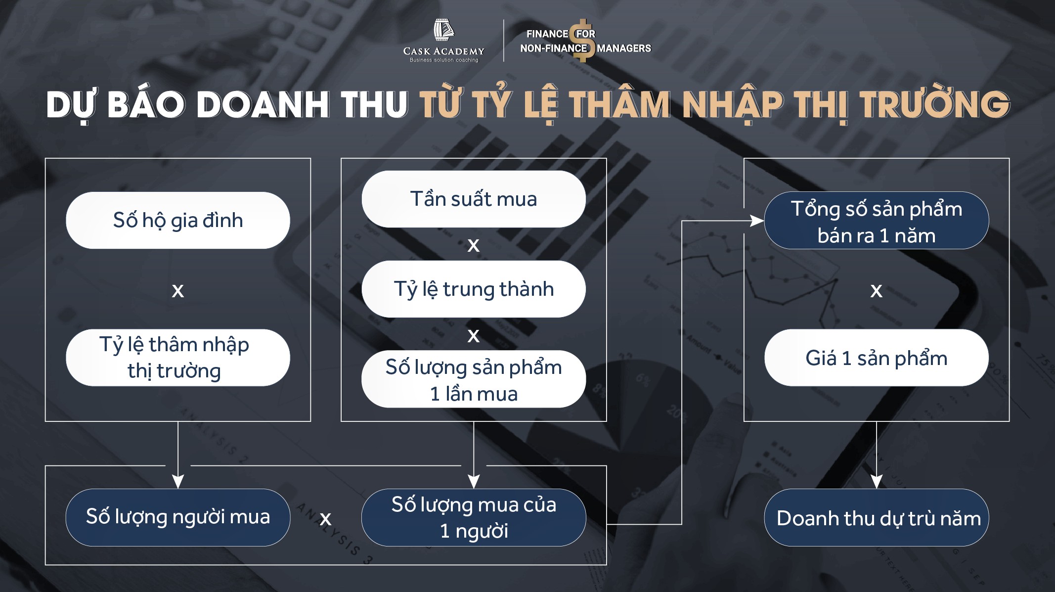 Trước tiên, chúng ta xác định xem trên thị trường, có bao nhiêu hộ gia đình mua sản phẩm của doanh nghiệp và mỗi hộ sẽ mua bao nhiêu sản phẩm, nhân 2 con số này lại với nhau ta sẽ có doanh số/doanh thu dự báo cho sản phẩm mới