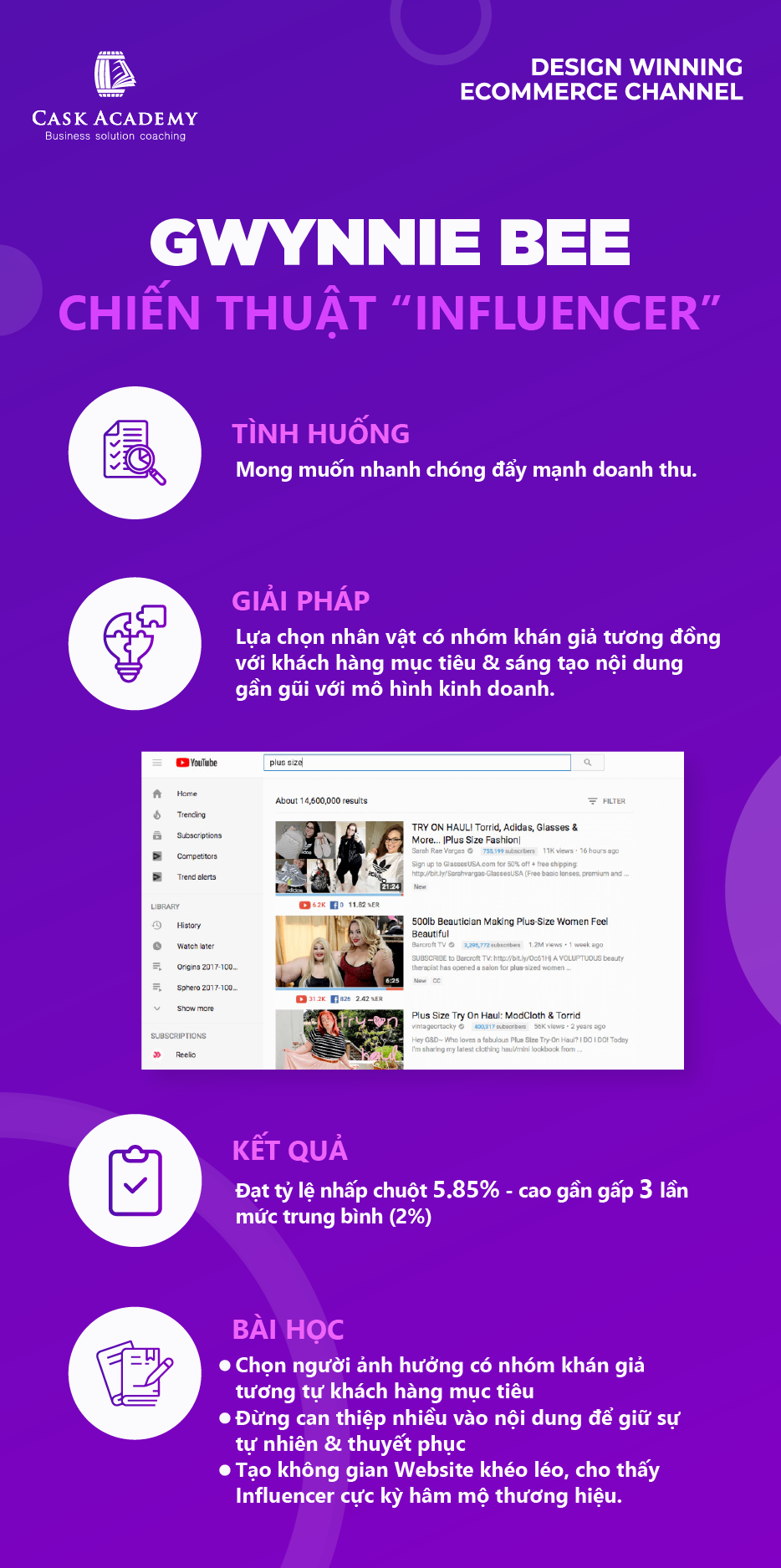 Bước đi tiếp theo của Gwynnie Bee mới thật đặc sắc, khác với cách làm thông thường. Thay vì chọn những người ảnh hưởng có kinh nghiệm làm việc với các nhãn hàng thời trang, họ chọn những nhân vật có nhóm khán giả tương đồng với khách hàng mục tiêu của họ; những nhân vật này thường sáng tạo những nội dung về lối sống, ẩm thực, mua sắm… gần gũi với mô hình kinh doanh của Gwynnie Bee.