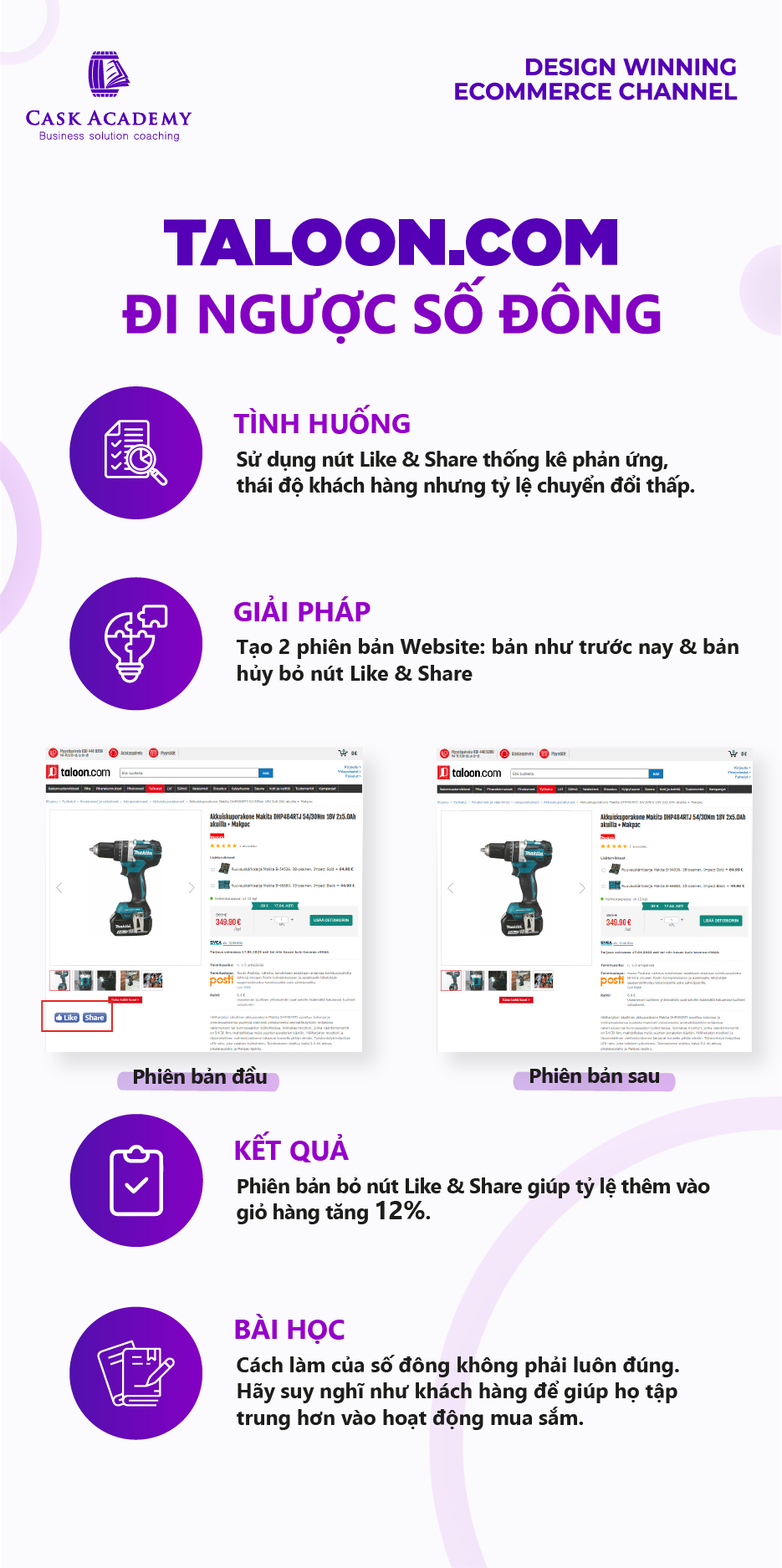 Theo quan điểm làm Marketing phổ biến hiện nay, chúng ta nên tận dụng chiến thuật bằng chứng cộng đồng – Social Proof – để tăng uy tín cho gian hàng và nhờ đó, đẩy mạnh doanh thu. Taloon.com cũng không ngoại lệ; họ sử dụng 2 nút ‘Thích’ – ‘Like’ và ‘Chia sẻ’ – ‘Share’ để thống kê phản ứng, biểu hiện thái độ của khách hàng. Thế nhưng, Tỷ lệ Chuyển đổi lại thấp đến khó hiểu; vì vậy họ nghi ngờ hiệu quả của 2 nút tương tác này. Suy cho cùng, bạn dùng một chiến thuật nào đó là để đạt mục tiêu kinh doanh, nếu bất thành, bạn hoàn toàn có thể từ bỏ nó.