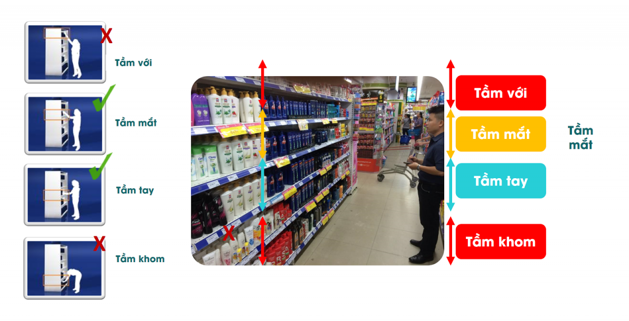 Một trong số đó là nguyên tắc “tầm mắt tầm tay”. Tức là sản phẩm chỉ nên để ở trong tầm mắt (chếch 15o-30o so với khi nhìn thẳng) và tầm tay (ngay dưới tầm mắt, ngang phần hông) của Shopper. Những sản phẩm để ở phía dưới cùng của kệ chỉ nên là những SKUs có pack size lớn, một số sản phẩm hàng xa xỉ có thể cân nhắc để ở các kệ trên cùng. Tuy nhiên, điều này nên được hạn chế hết mức có thể.