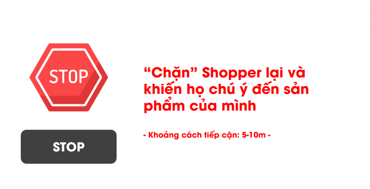 Tiêu chí đầu tiên là “Stop”. Một POSM hay kệ trưng bày phụ được cho là tốt khi đủ bắt mắt để khiến Shopper dừng lại và để ý đến thông điệp hoặc sản phẩm đặt trên nó. Thường thì Shopper sẽ bắt đầu chú ý đến một POSM hoặc kệ trưng bày từ khoảng cách 5-10m, chính vì vậy họ chưa thể nhìn thấy rõ hình ảnh hay đọc được thông điệp trên POSM. Lúc này, các hình khối có kích thước lớn, độc đáo hoặc màu sắc sặc sỡ sẽ là những yếu tố chính khiến Shopper chú ý đến sản phẩm.