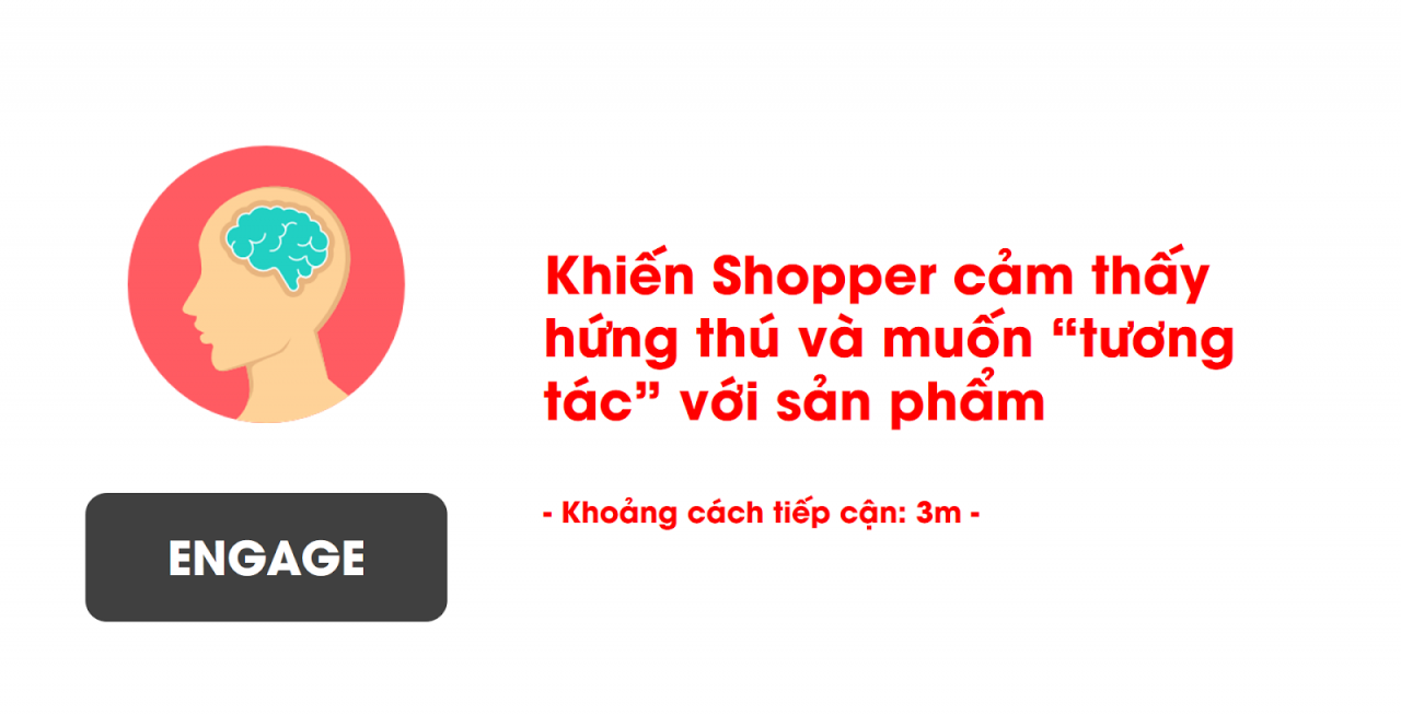 Sau “Stop” là “Engage”. Nền tảng của hầu hết quyết định mua hàng lần đầu tiên là “sự hứng thú”. Khi đã khiến Shopper dừng bước và tiến đến gần sản phẩm, POSM phải tạo được sự hứng thú từ phía Shopper bằng cách sử dụng những hình ảnh bắt mắt, mới lạ. màu sắc tương phản hoặc những khuyến mãi, tính năng nổi bật của sản phẩm.