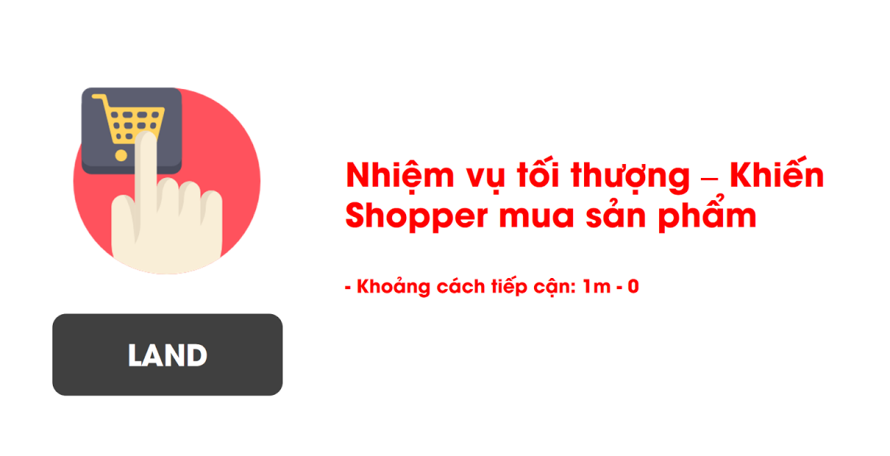 Cuối cùng, mọi hoạt động cũng nhằm dẫn đến hành vi mua hàng – “Land”. Để đáp ứng tiêu chí này, POSM cần phải đưa ra những thông điệp đúng với Shopping Motive của Shopper mục tiêu, có Call to action rõ ràng, ngắn gọn. Ngoài ra, người làm Trade Marketing có thể cân nhắc kết hợp Merchandising & POSM với những hoạt động kích thích 5 giác quan của Shopper (phát sampling, cho thử sản phẩm, tận dụng mùi hương,..).**