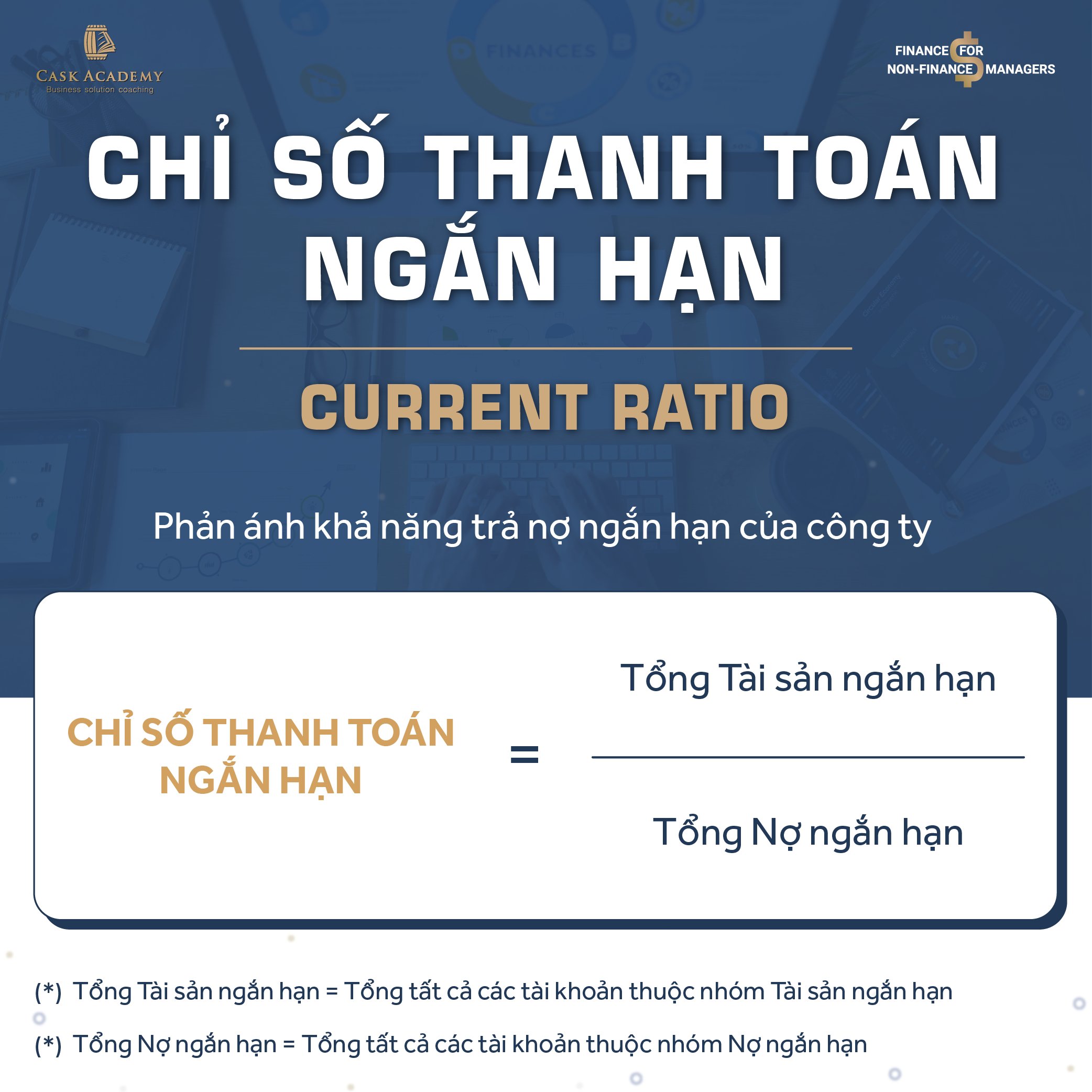 Công thức: Chỉ số thanh toán ngắn hạn = (Tổng Tài sản ngắn hạn) / (Tổng Nợ ngắn hạn)