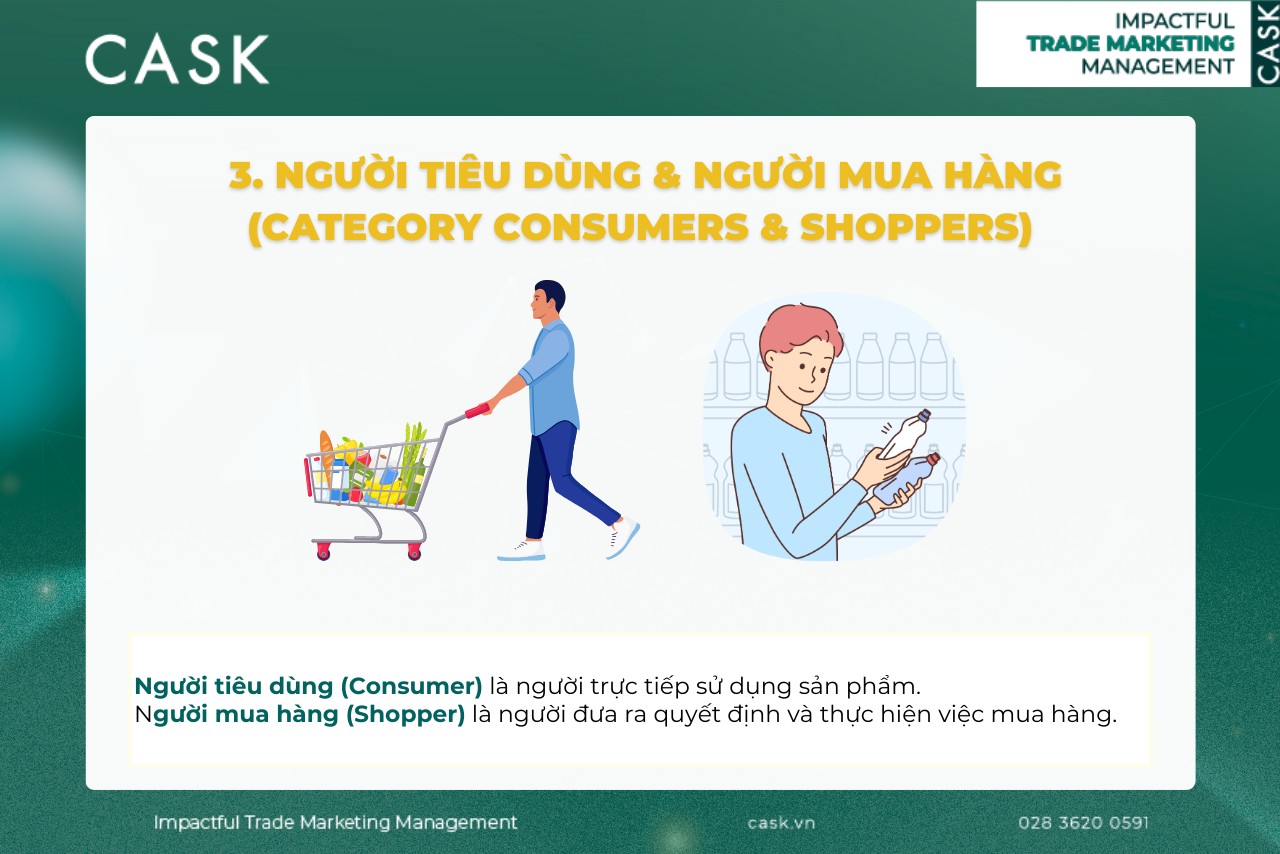 Người tiêu dùng (Consumer) là người trực tiếp sử dụng sản phẩm, trong khi shopper (người mua hàng) là người đưa ra quyết định và thực hiện việc mua hàng. Trong nhiều trường hợp, consumer và shopper có thể là cùng một người (ví dụ: mua nước ngọt để uống), nhưng cũng có khi là hai đối tượng khác nhau (ví dụ: mẹ là shopper, bé là consumer của sữa chua). Hiểu rõ sự khác biệt này là nền tảng quan trọng để thiết kế chiến lược Trade Marketing chính xác.