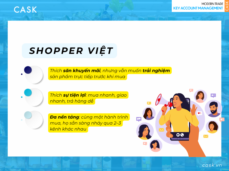 Đối với Key Account Manager, insight này đặc biệt quan trọng. KAM không chỉ cần hiểu rằng shopper đang “đa nền tảng”, mà còn phải biết thiết kế chương trình trưng bày, khuyến mãi và chính sách giá theo hành trình đa kênh. Khi KAM và retailer cùng nhau đồng bộ hóa trải nghiệm, shopper sẽ cảm nhận được sự tiện lợi và tin tưởng hơn vào thương hiệu – yếu tố then chốt để giành ưu thế trong Modern Trade.