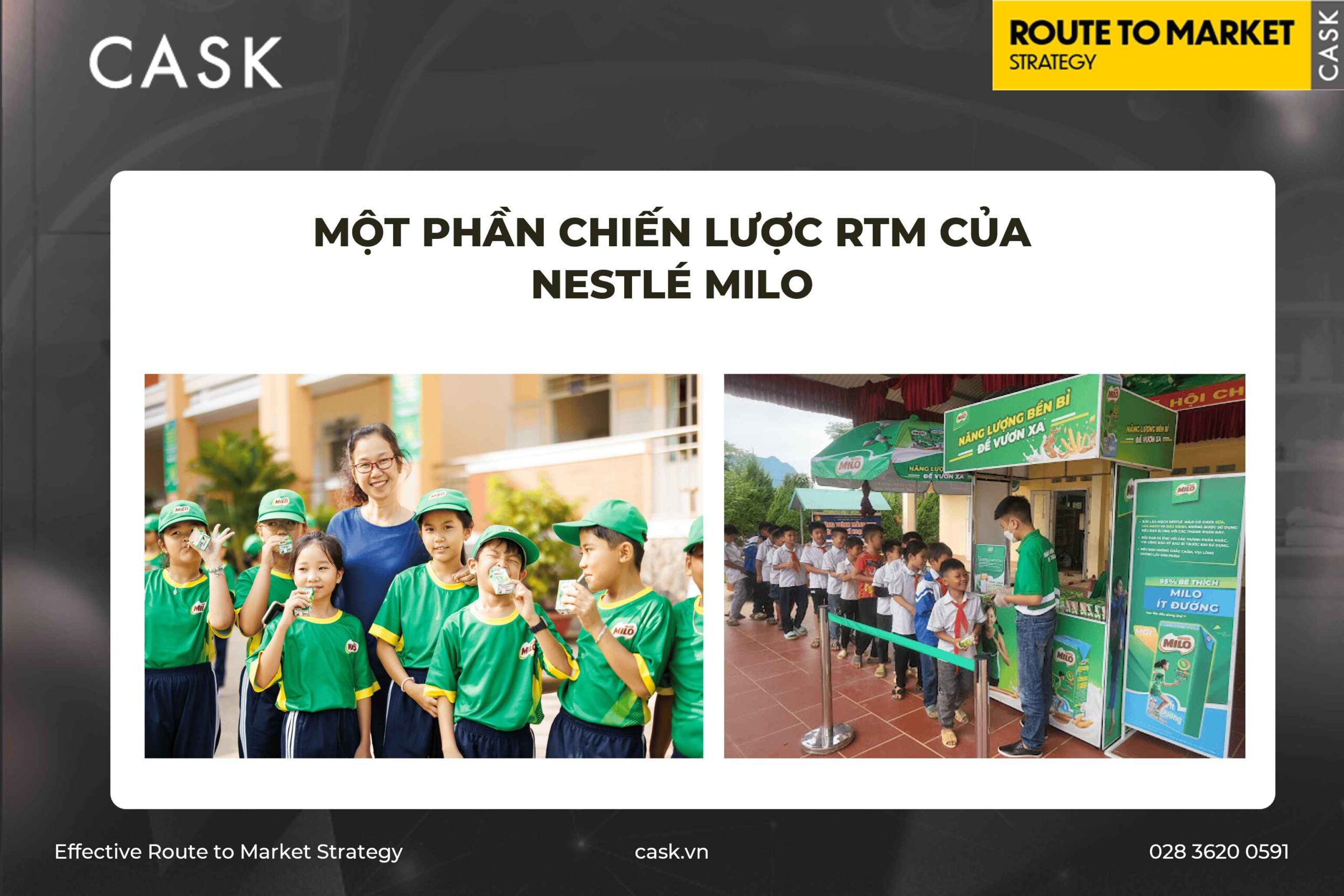 Sản phẩm Nestlé MILO có mặt ở Việt Nam vào năm 1994. Được đánh giá là “nhập gia” khá muộn so với những hãng sữa nước ngoài khác, và thậm chí so với “ông trùm” sữa Vinamilk (ra đời năm 1976) mang lợi thế đá trên sân nhà, Nestlé MILO có vùng lợi thế ít hơn hẳn (MobiWork, 2022). Tuy nhiên, thay vì cạnh tranh trực diện trên kệ hàng hóa, MILO xây dựng chiến lược RTM riêng, tập trung tiếp cận học sinh – nhóm tiêu dùng cốt lõi. Thương hiệu triển khai hàng loạt chương trình tặng sữa miễn phí tại các trường tiểu học, thiết lập các ki-ốt phát sản phẩm ngay trong khuôn viên trường và tổ chức chuỗi hoạt động gắn liền với thể thao học đường.