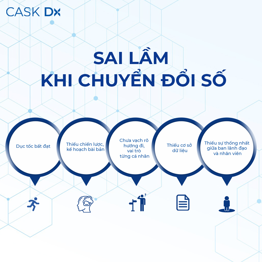 Theo kết quả nghiên cứu từ BCG mới đây, có đến 70% dự án chuyển đổi số thất bại hoặc không đạt đúng mục tiêu đề ra ban đầu. Để lọt nhóm 30% còn lại, chúng ta cần làm cái đúng và đồng thời tránh làm cái sai; vì vậy hãy cùng Cask điểm qua 10 cạm bẫy phổ biến hiện nay khi làm chuyển đổi số để có sự chuẩn bị tốt nhất trước khi bắt tay vào công cuộc đổi mới này.