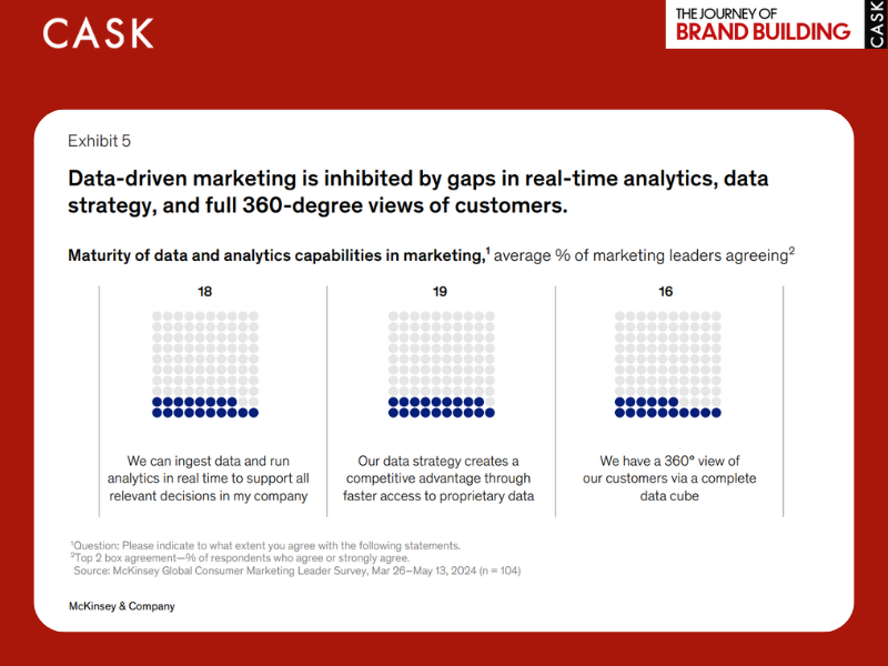 - Đặt phân tích và dữ liệu khách hàng vào trung tâm. Tăng trưởng do marketing dẫn dắt phải dựa trên dữ liệu, để đảm bảo rằng mọi quyết định chiến lược đều dựa trên sự thật và xuất phát từ thấu hiểu sâu sắc người tiêu dùng. Tuy nhiên, nhiều marketer vẫn gặp khó khăn khi tận dụng triệt để phân tích và insight để đưa ra quyết định. Thực tế, 64% người tham gia khảo sát cho biết các quyết định marketing của họ không chủ yếu dựa trên phân tích dữ liệu.