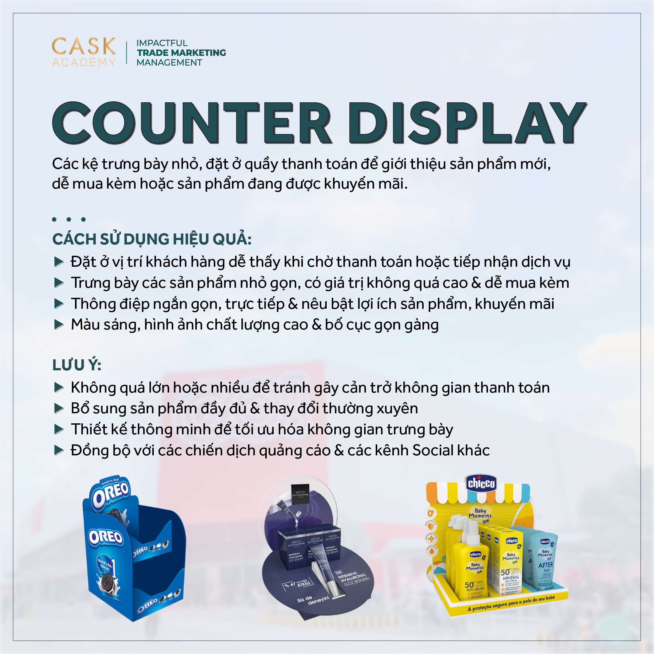 - Kiểm tra & cập nhật định kỳ: Thường xuyên kiểm tra Counter Display để đảm bảo rằng nó luôn ở trong tình trạng tốt, sản phẩm được bổ sung đầy đủ & thay đổi thường xuyên để giữ sự mới mẻ và hấp dẫn.