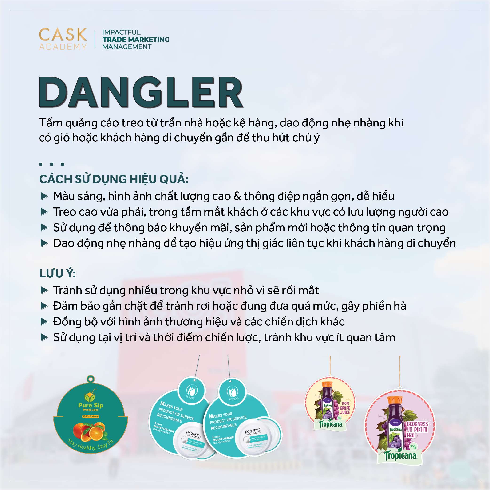 - Không gây rối mắt: Tránh sử dụng quá nhiều Dangler trong một khu vực nhỏ vì sẽ gây rối mắt và làm giảm hiệu quả tiếp thị. Chỉ nên sử dụng Dangler cho những sản phẩm hoặc thông điệp quan trọng.