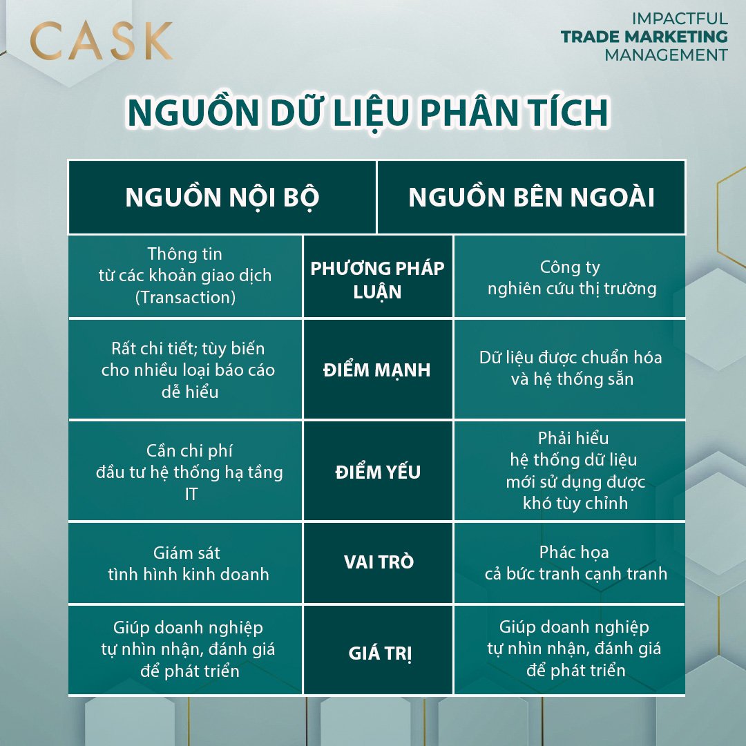 Như bạn đã thấy, việc phân tích nên kết hợp cả 2 nguồn dữ liệu nội bộ & bên ngoài, bởi chúng có mạnh yếu khác nhau, có thể bổ trợ lẫn cho nhau. Phụ thuộc riêng vào một nguồn dữ liệu sẽ hạn chế giá trị & độ chính xác phân tích.