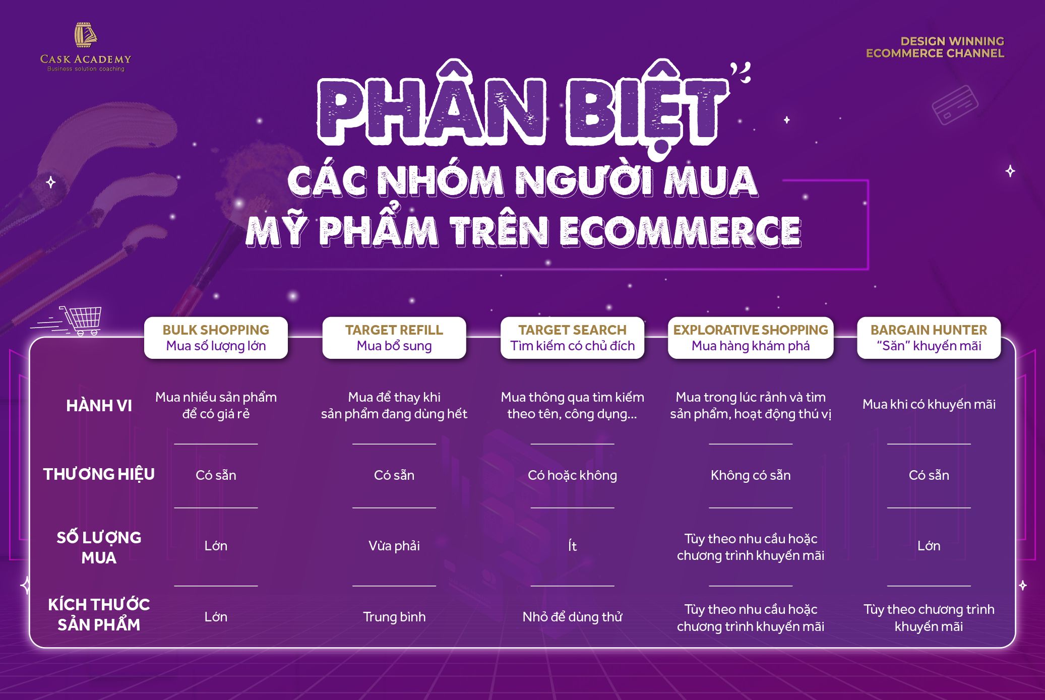 Dưới đây là bản mô tả chi tiết về hành vi mua hàng của 5 nhóm người mua hàng thường gặp trên sàn thương mại điện tử. Hãy cùng tìm hiểu trong mỗi nhóm người mua hàng, doanh nghiệp mỹ phẩm sẽ có những cách nào để bán được nhiều hàng hơn.