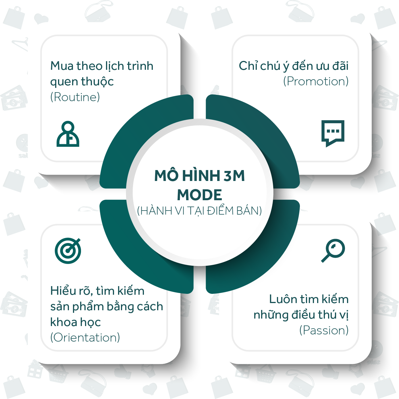 3. Motive – Những nhu cầu, mong đợi, và thái độ của Shopper – tương ứng với từng Shopping Mode khác nhau. Shopping Motive thể hiện những yếu tố sâu sắc có thể khiến Shopper cảm thấy thích thú và thay đổi hành vi mua hàng, nếu chỉ quan sát thông thường, bạn khó thể nhận biết các yếu tố này. Shopping Motive trả lời cho câu hỏi then chốt: điều gì thôi thúc họ mua hàng?