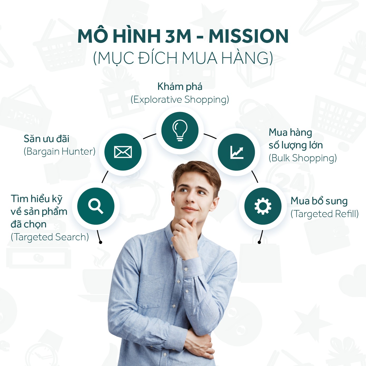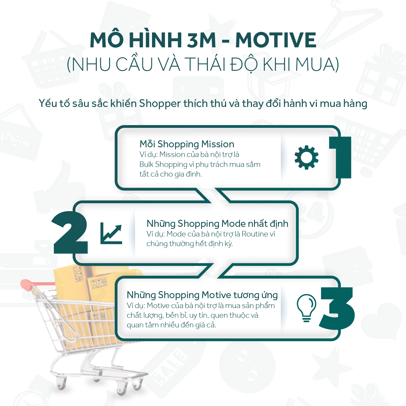 Mỗi chữ M đại diện một yếu tố trong hành vi mua sắm của Shopper: (1) Mission là nhiệm vụ hay mục tiêu mua hàng; (2) Mode là cách thức mua hàng và (3) Motive là động cơ, tức nhu cầu của Shopper khi mua hàng. Sau đây, chúng ta sẽ đi vào chi tiết từng M trong mô hình 3M: