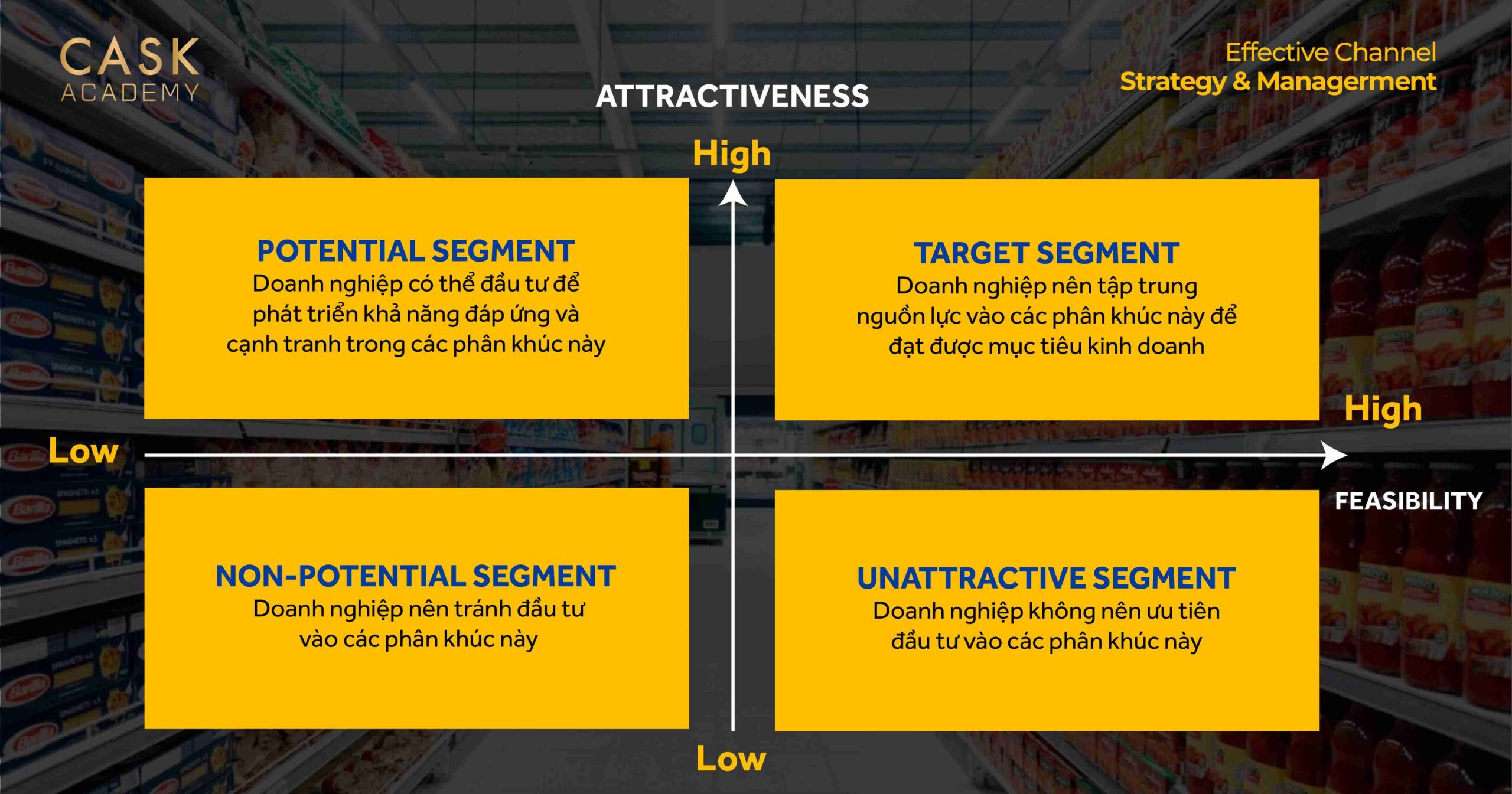 Tóm lại, đánh giá phân khúc ngành hàng chính là đánh giá mức độ hấp dẫn và khả năng đáp ứng nhu cầu của doanh nghiệp với các phân khúc ngành hàng đó.