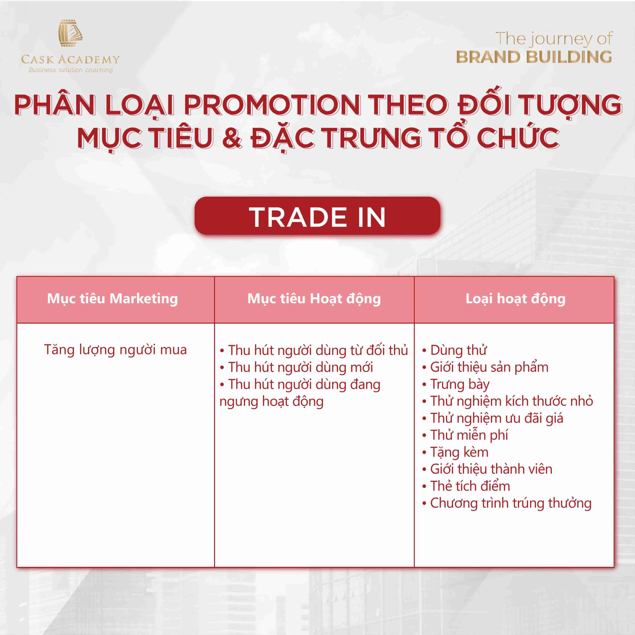 - Trade In – Tăng doanh số bán cho Shopper: [1] Tăng độ xâm nhập sản phẩm: thu hút thêm Shopper; [2] Tăng tuần suất mua hàng: Shopper mua hàng nhiều lần hơn trong một khoảng thời gian; [3] Tăng giá trị giỏ hàng: tăng số tiền Shopper bỏ ra mua hàng/lần mua.