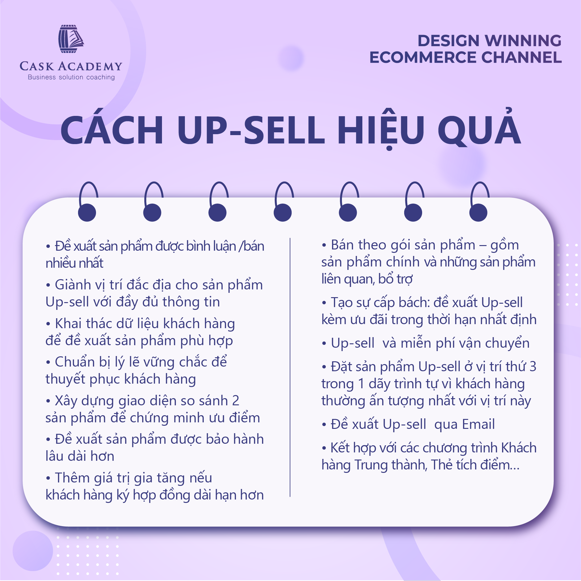 Một nguyên tắc bạn nên luôn tuân thủ là đề xuất sản phẩm cùng ngành hàng với sản phẩm khách hàng định mua bởi chúng đáp ứng cùng những nhu cầu cơ bản; giá sản phẩm Up-sell cũng không nên cao quá 40% giá sản phẩm chính. Ngoài ra, bạn không nên thúc ép khách hàng và nên đưa thông tin sản phẩm nâng cao ở bên dưới sản phẩm chính hoặc chỉ đề xuất Up-sell sau khi khách đã chọn mua.