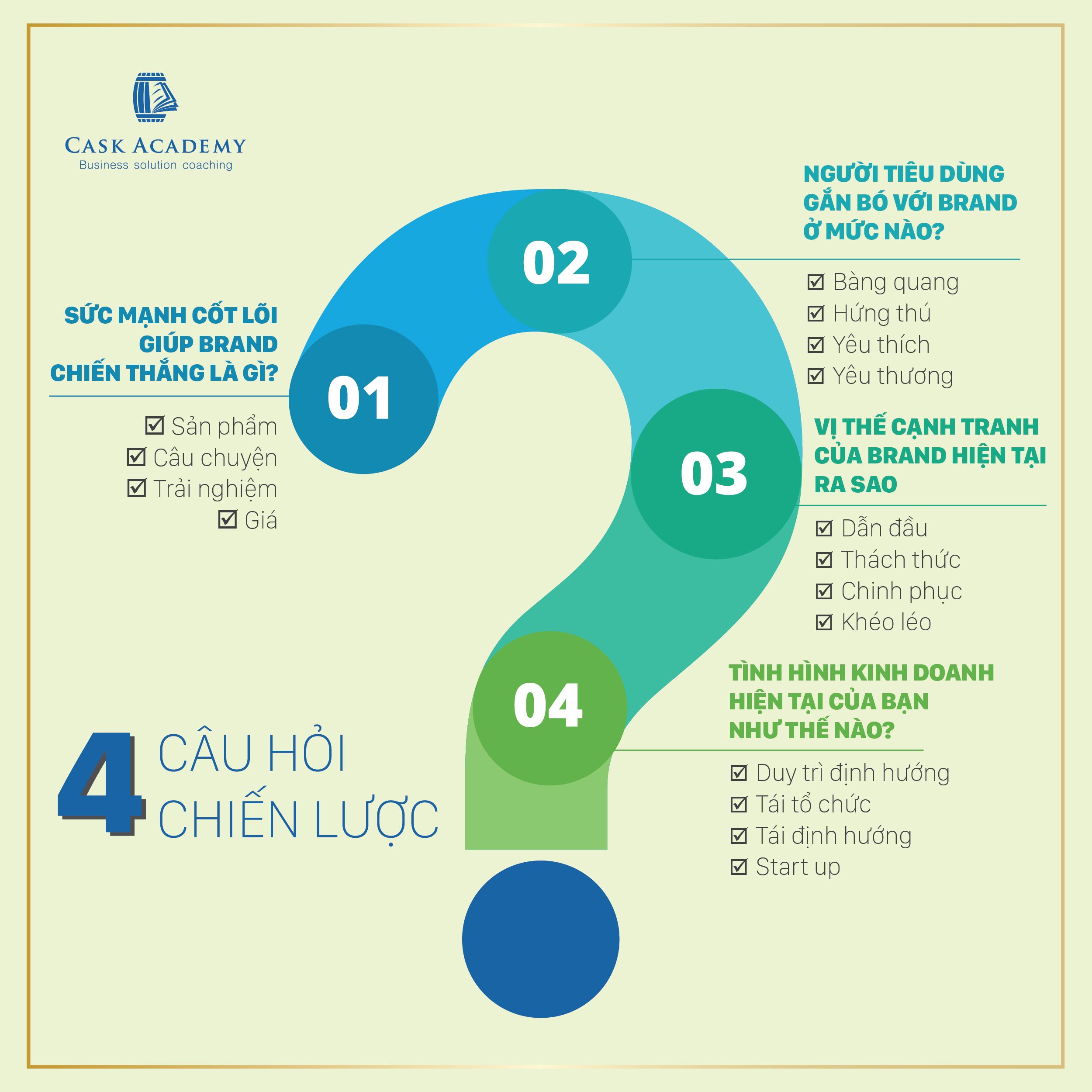 Như đã nói ở phần trước, đối với nhà chiến lược, câu hỏi quan trọng hơn câu trả lời. Sau đây là bộ 4 câu hỏi giúp bạn xem xét Brand toàn diện: